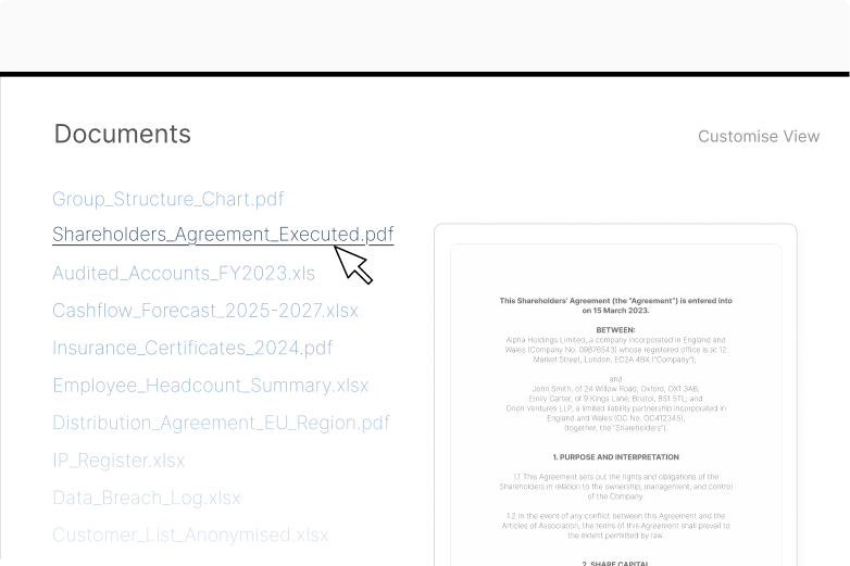 A virtual data room is a secure online space used to store and share sensitive documents during M&A transactions. It allows sellers to organise information, control access, and manage buyer interactions in a structured, auditable environment—supporting efficient due diligence.